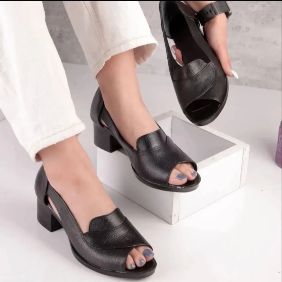 کفش تابستانی تمام چرم طبیعی گاوی مدل رها پاشنه ۵ سانت