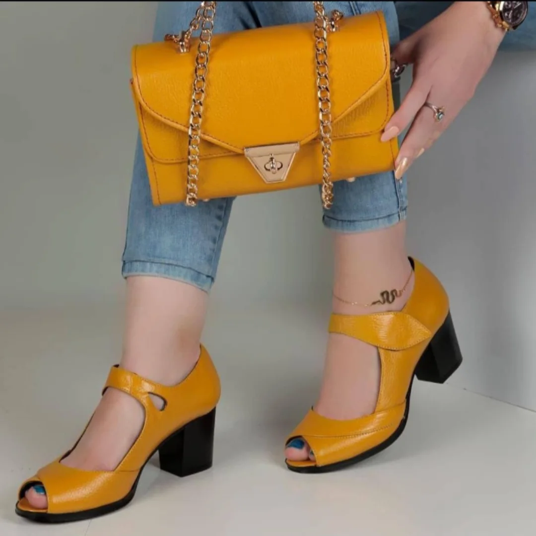 کفش تابستانی تمام چرم طبیعی گاوی مدل الناز پاشنه ۵سانت